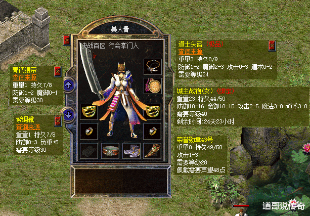 第四,服饰系列最后瞧瞧服饰系列,首先就是那鹤立鸡群的城主战袍,此前老道分享的都是男战袍,这女战袍风格是不是看起来眼前一亮呢?其均衡的五属性加持自然不用多说,傲视全区。攻3道2道士头盔强悍且可惜,攻3荣誉勋章是巅峰,还有青铜腰带和紫绸靴同样是巅峰。这服饰五件套让女城主的防御和魔御属性拉满的情况下还有攻击属性加持,确实霸气。综合来看这位女城主的穿搭是攻防一体,其中还有高魔御属性加持,在团战活动中可谓是无人能比的强悍。