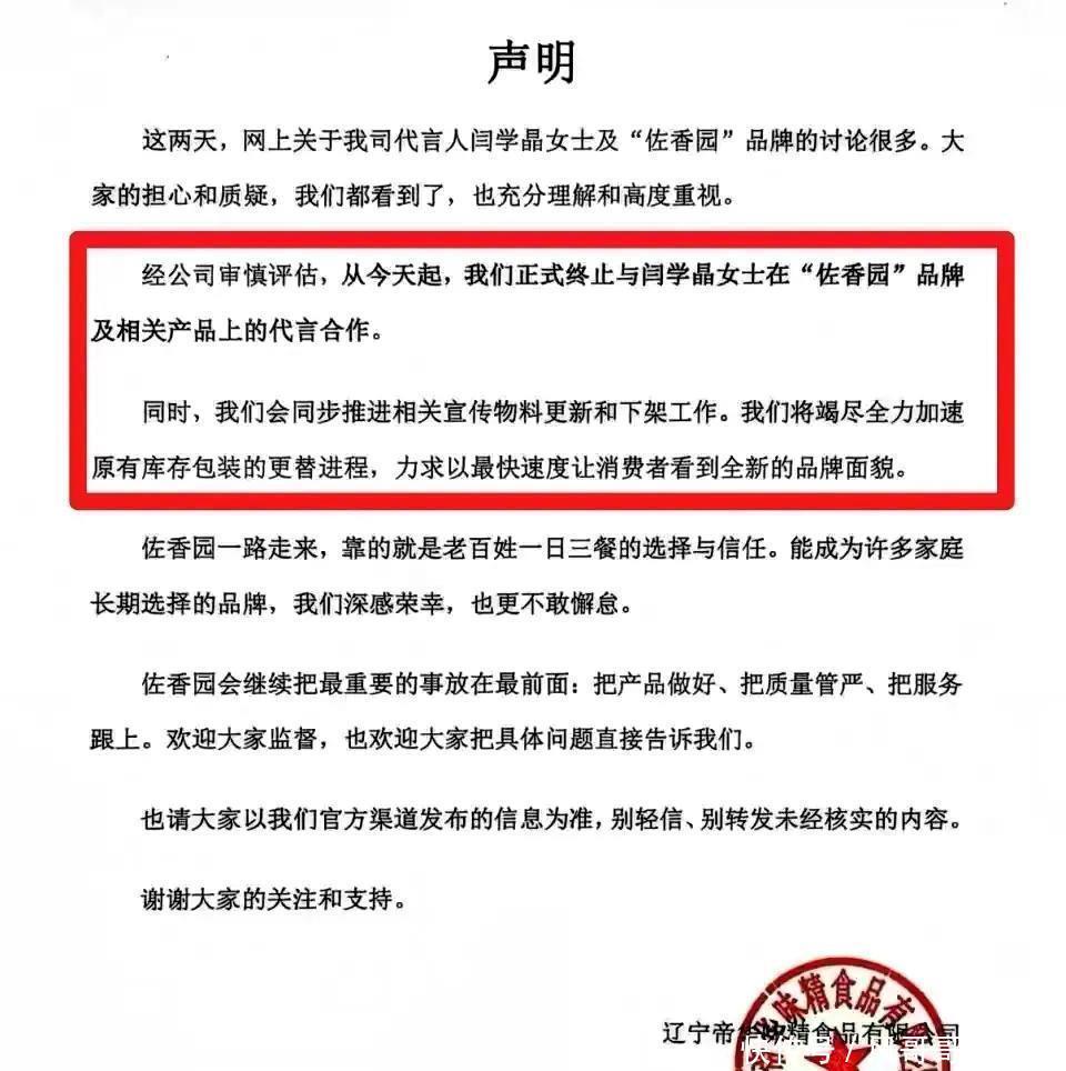 1月11日一早,调味品品牌佐香园对外发布音信,晓谕将片面撤消与演员闫学晶的勾通关系,同期运转居品包装的更换职责。