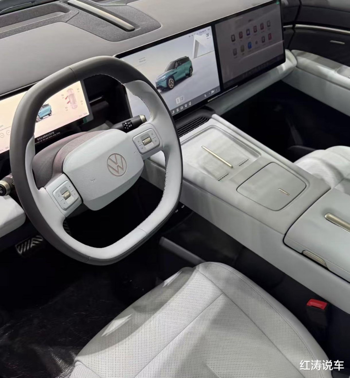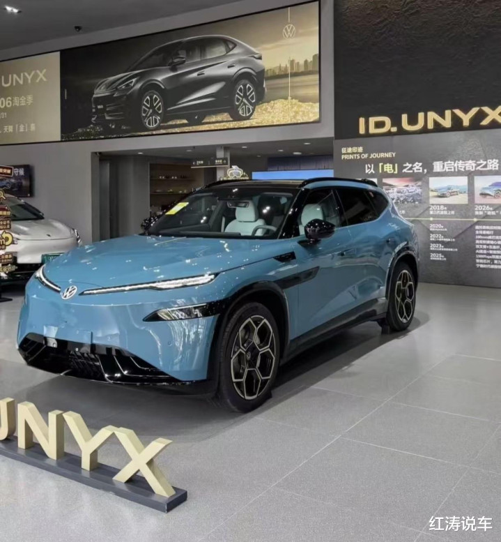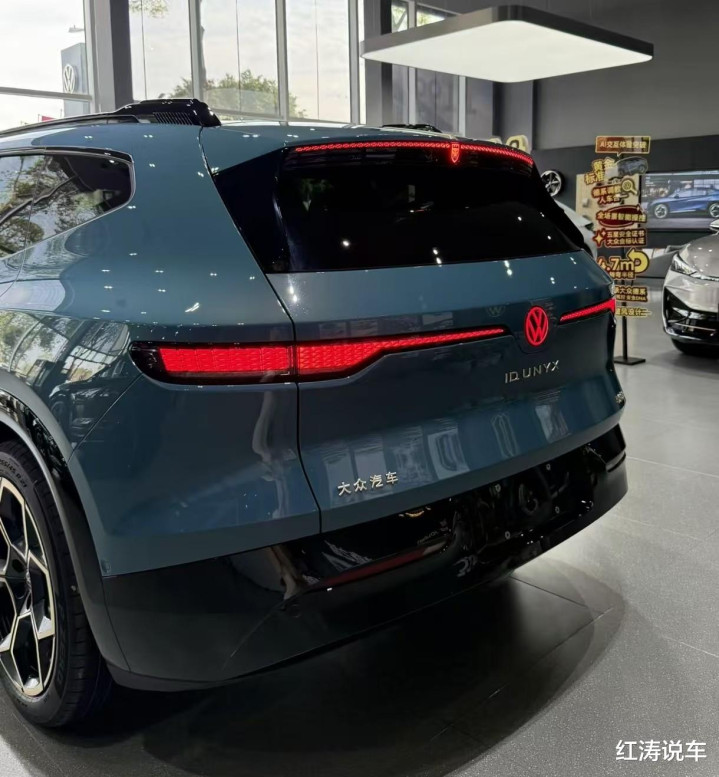 与众08的尾部十分耐心,车顶终局有扰流板和灵感源自沃尔夫斯堡的“狼标”高位刹车灯,尾灯造型与前灯组呼应,将复古自界说交互,可在解锁、靠岸、驾驶等不同场景下呈现各别化的动态灯光响应,尾灯中央雷同带有可发光红色专家尾标,下侧为“ID.UNYX”金色记号。