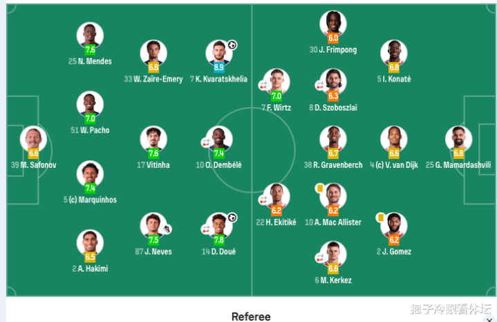 巴黎首发:39-萨福诺夫、2-阿什拉夫、5-马尔基尼奥斯、51-帕乔、25-努诺·门德斯、17-维蒂尼亚、87-若奥·内维斯、33-埃梅里、10-登贝莱、14-杜埃(78’19-李刚仁)、7-克瓦拉茨赫利亚。