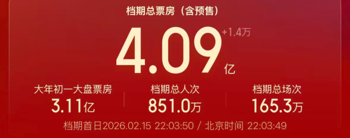 基于当下预售施展,据灯塔AI票房预测,2026大年月朔票房将达11.87亿,预测当日票房有望过亿的电影包括《驰骋东谈主生3》《惊蛰无声》《熊出没・年年有熊》《镖东谈主:风起大漠》,其中,《驰骋东谈主生3》《惊蛰无声》两片有望差别以5亿、2.8亿的施展揽下近七成票房。