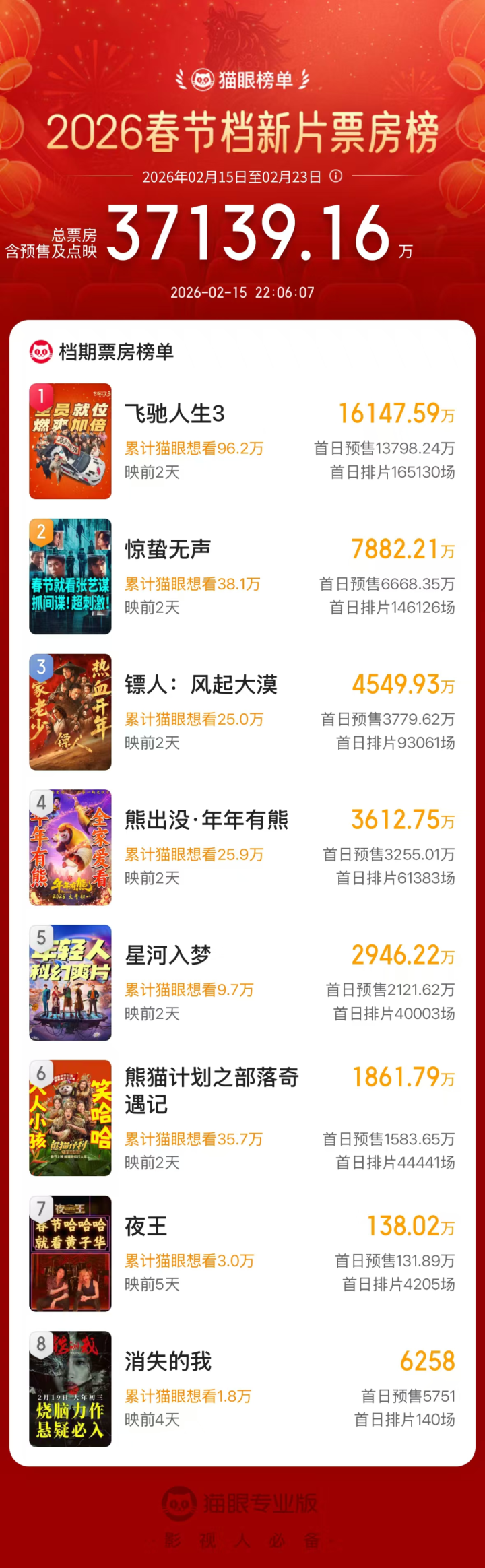 此外,春节档新片预售票房已坎坷3.7亿元。其中《驰骋东谈主生3》独占鳌头,大幅跳跃第二名《惊蛰无声》,《镖东谈主:风起大漠》《熊出没・年年有熊》《银河入梦》位列3—5名。