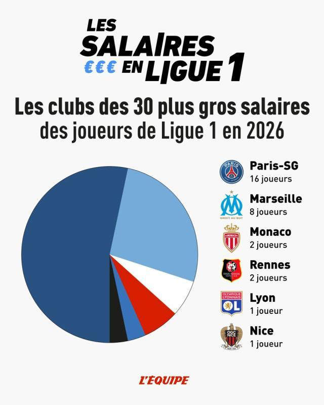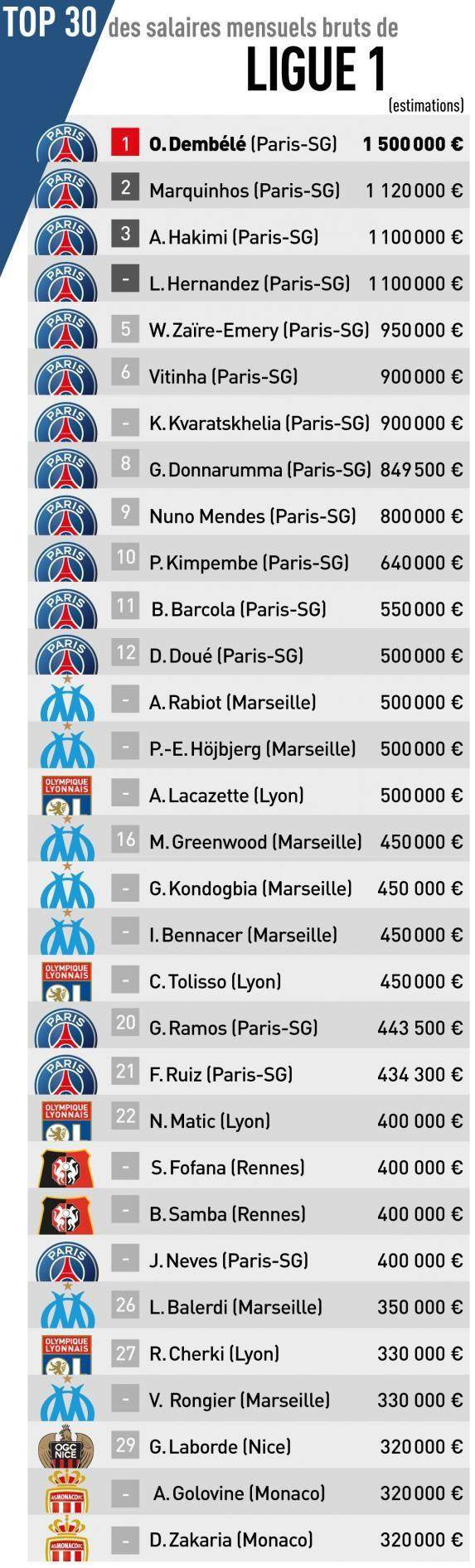 法国《队报》每年齐会在公布法甲球员的薪资榜,这一风气已抓续近十年。本年最初公布的榜单前30名中,巴黎圣日耳曼络续霸榜,共有16名球员入榜。且一说念在前20,其中金球奖得主登贝莱以150万欧元月薪成为法甲“打工天子”。