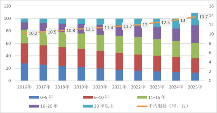 2016年至2025年,油运平均船龄由10.2年逐年上升至13.7年,为历史新高。从船龄结构看,2016年以来20年以上船龄运力占比逐年擢升,澳客app官网至2025年末达20%。20年以上船龄油轮基本属于“口头运力、低效供给”,其灵验运力仅为新船的30%–50%,航速显耀下降,维修停航技巧为新船的2–3倍,故障频率显耀上升。