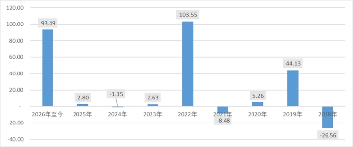 从2018年于今各年度涨幅看,2019年、2022年、2016年区分高涨44.13%、103.55%、93.49%。累积过热潮幅后,随后两至三年报酬往往欠安。拉长技巧看,仅有2006年和2007年终了勾通两年涨幅超20%,但2008年当场着落77%。