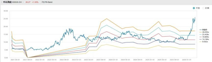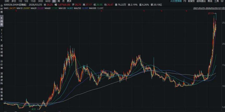 弃世2026年3月24日,中远海能收盘价25.56元,近五年区间涨幅3.3倍(前复权),其中近一年涨幅1.4倍。其主升段出面前2021至2022年,以及2026年1月以后。