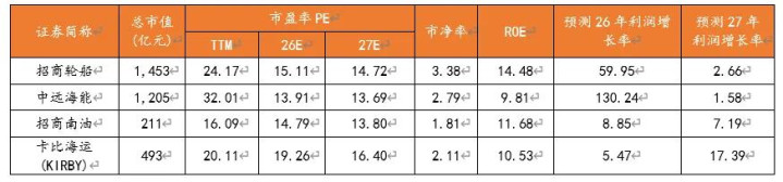 与同行比拟,推敲各公司事迹弹性,从2026年预测PE看,中远海能、招商南油估值左右。招商南油内贸油运市占率超40%,航路踏实、资本可控,重叠纸浆等补助业务孝敬踏实毛利,2025年净利率22.74%。