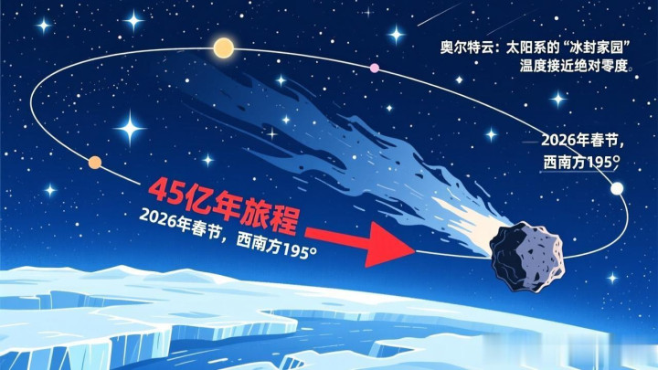 45亿年前,当太阳系依然一团旋转的气体与尘埃,这颗彗星被木星的引力弹弓抛入奥尔特云,千里睡了数十亿年。它从未见过东谈主类,却在2026年春节的这个夜晚,与咱们再会。