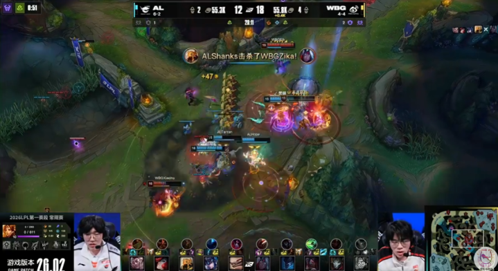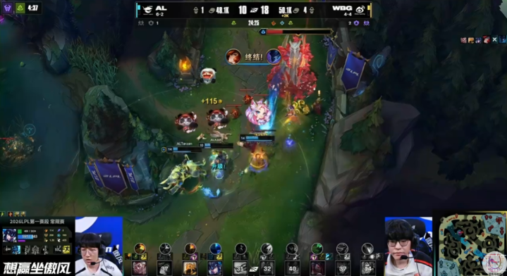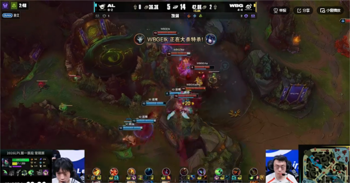 AL前期一波是Flandre在打野帮忙之后,自己失误送塔导致浪费了优势,另一波则是上路混战溃败,导致维鲁斯直接被养肥。立春之后的小虎阿卡丽这局也是在前期打出了很高的伤害,帮助WBG巩固住了优势。经济优势,3条小龙优势,20分钟时候的WBG看起来确实不知道该怎么输。