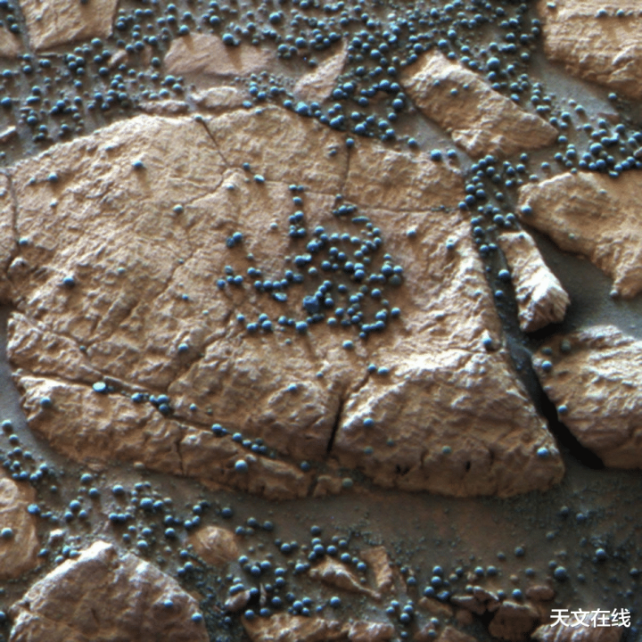 如火星探索漫游者机遇号所拍摄的赤铁矿球体(或称火星蓝莓)相片所示。这张相片拍摄于火星低地、海拔较低处,东说念主们以为这里曾被液态水笼罩,如今地表已露出在外。有水的当年是这些小球体形成最受深爱的解释场景。许多小球体相互相连的事实为此提供了额外有劲的把柄,因为唯有在有水源的情况下,这种相连情况才会发生。尽管在地球上,肖似的球体频繁标明有生命存在,但科学家们以为,火星上的这些球体是无机成因的。 图片起原:好意思国国度航空航天局喷气鼓动实验室加州理工学院康奈尔大学