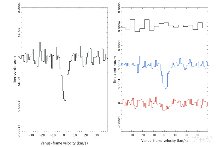 把握ALMA得回的、以磷化氢J10跃迁波长为中心的金星云层给与光谱。左图是全行星平均值,右图从上到下挨次骄矜极地(玄色)、中纬度(蓝色)和赤说念(红色)区域的光谱。由于某种原因,信号在中纬度地区最强且唯独清楚。即使到现在,对这些数据的解读仍然存在很大争议。起原:J.Greaves等东说念主,《天然》。