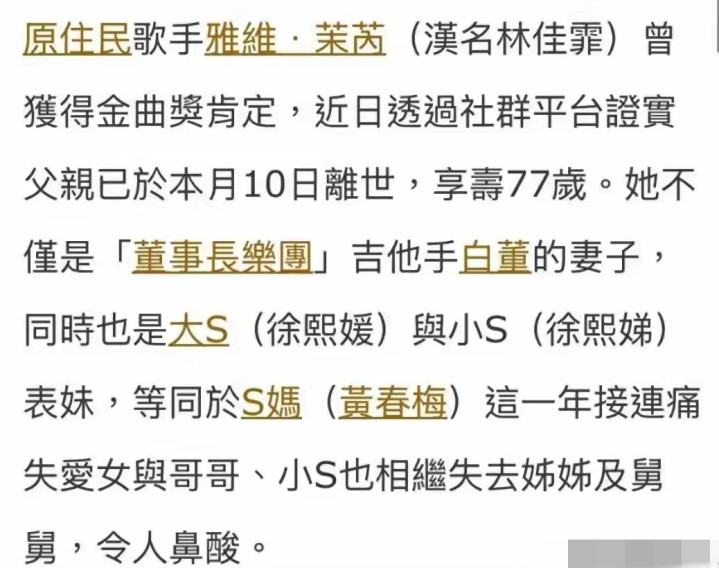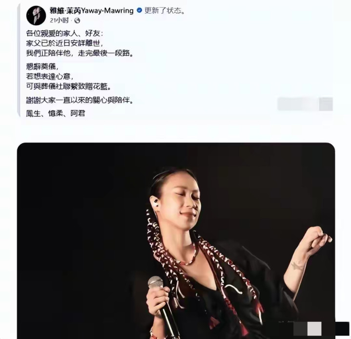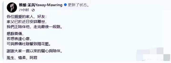 金曲奖歌手雅维·茉芮平直发讣告!77岁父亲走了!这东说念主恰是S妈黄春梅的亲哥哥!